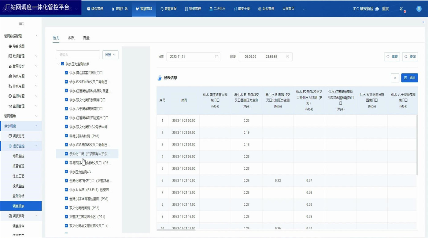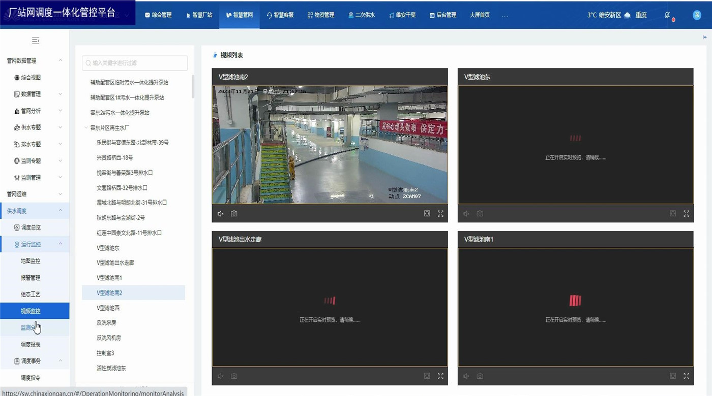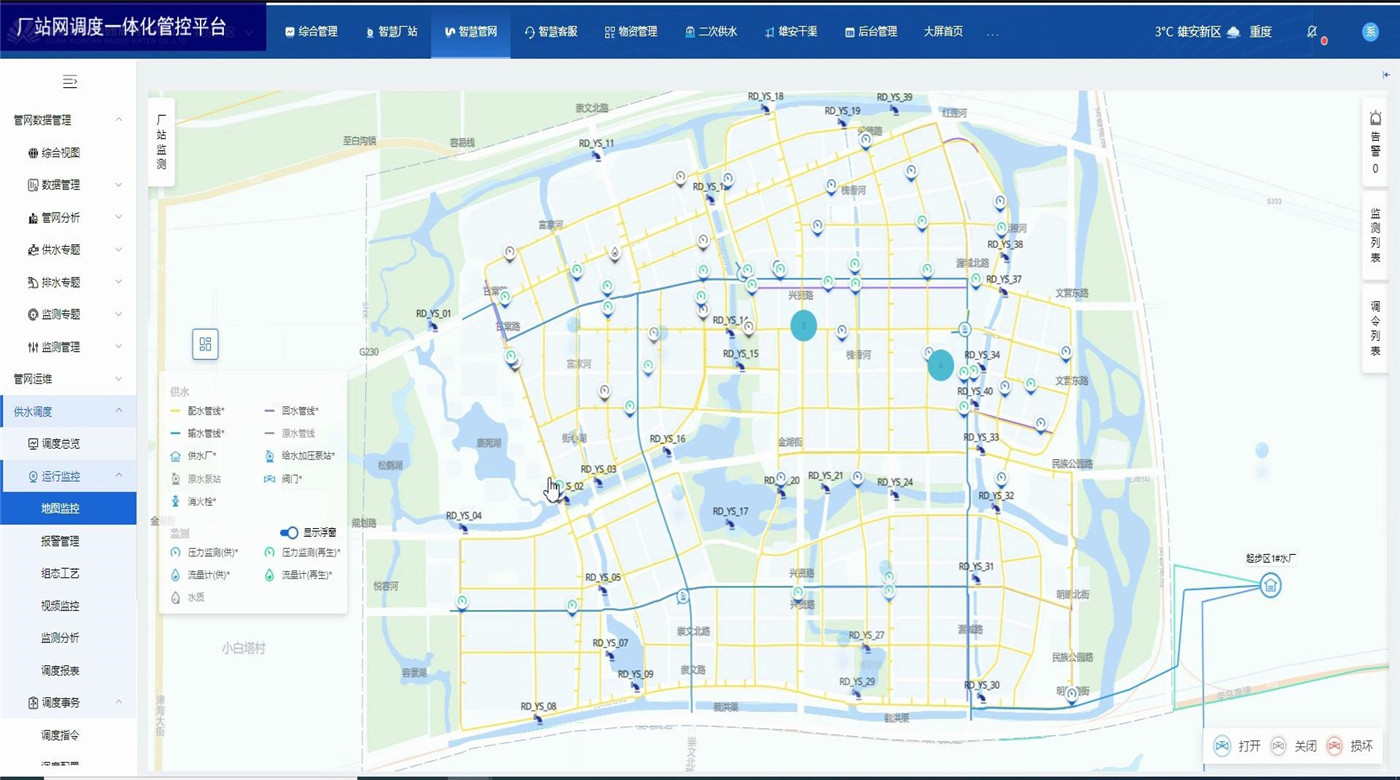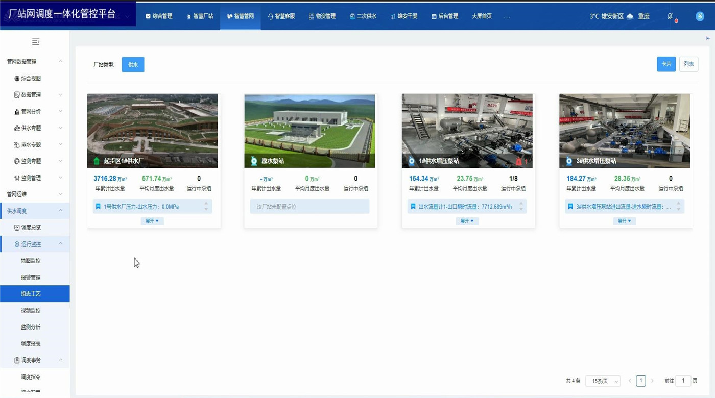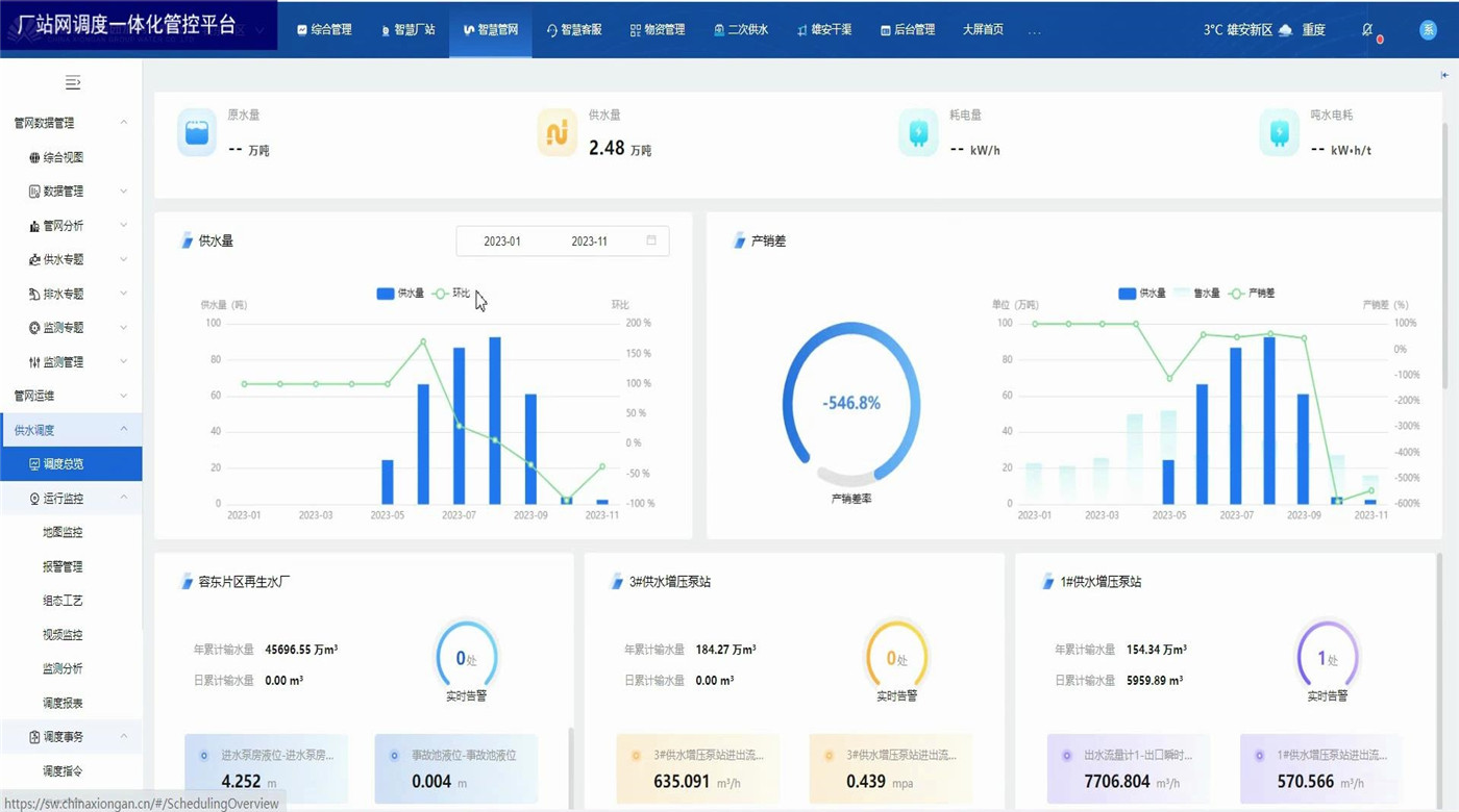 廠站網(wǎng)調(diào)度一體化管控平臺(tái)為水務(wù)企業(yè)各級(jí)領(lǐng)導(dǎo)和調(diào)度人員以及水廠工作人員提供總體運(yùn)行情況和關(guān)鍵的實(shí)時(shí)數(shù)據(jù)。展示內(nèi)容包括水廠、泵站等廠站的供水量、產(chǎn)銷差、進(jìn)出水流量、液位、壓力等關(guān)鍵數(shù)據(jù),水廠泵站視頻監(jiān)控,設(shè)備閾值報(bào)警,監(jiān)測(cè)數(shù)據(jù)分析,調(diào)度報(bào)表管理等。方便調(diào)度員一眼掌握當(dāng)前調(diào)度策略對(duì)實(shí)時(shí)數(shù)據(jù)的影響,及時(shí)觀察關(guān)鍵數(shù)據(jù)并作出臨時(shí)調(diào)整。